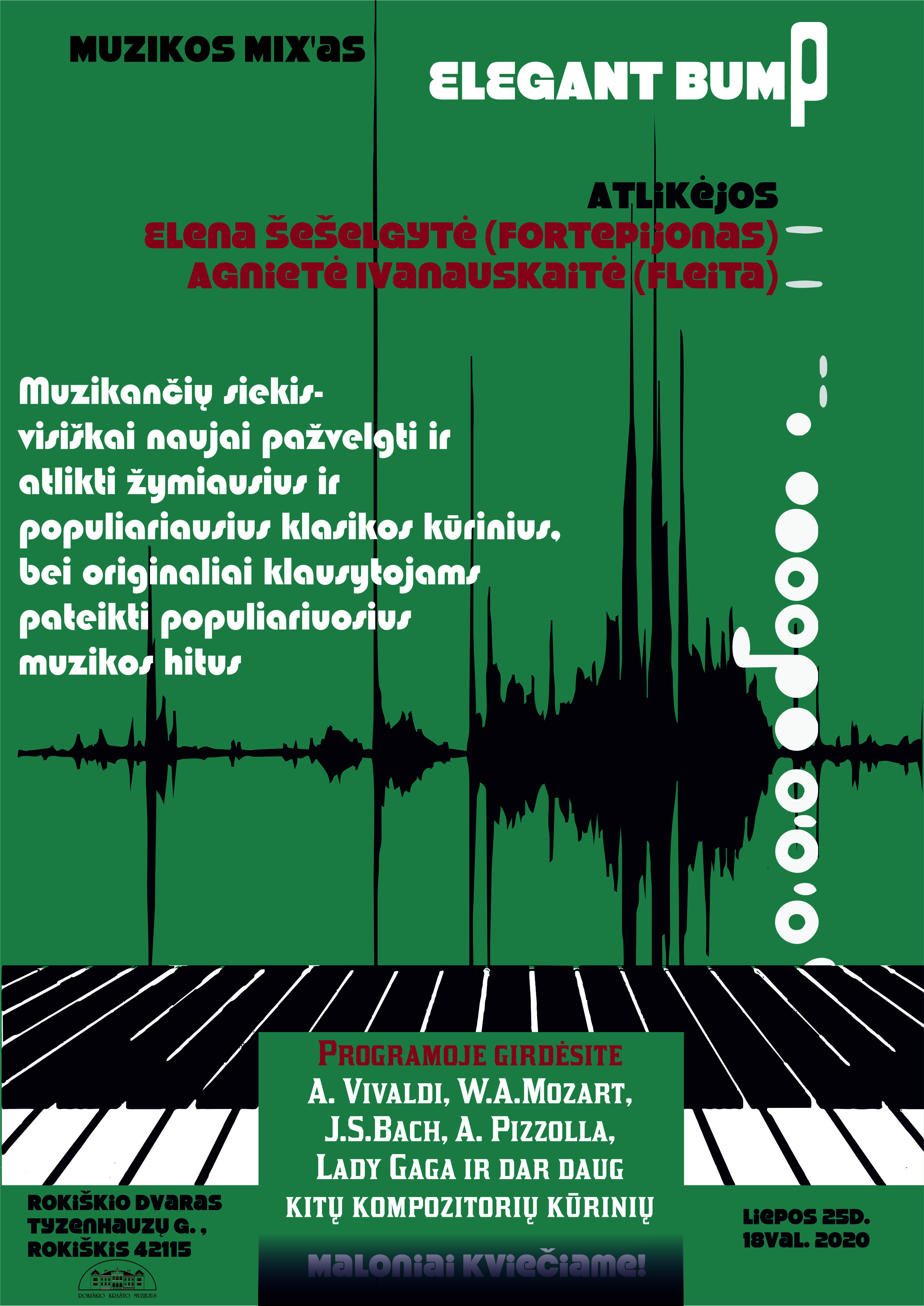Liepos 25 d. 18 val. Rokiškio krašto muziejuje vyks koncertas „Muzikos Mix’as“. Elena Šešelgytė (fortepijonas) ir Agnietė Ivanauskaitė (fleita). Muzikančių siekis – visiškai naujai pažvelgti ir atlikti žymiausius ir populiariausius klasikos kūrinius bei originaliai klausytojams pateikti populiariuosius muzikos hitus. Programoje girdėsite A. Vivaldi, W.A.Mozart, J.S.Bach, A. Pizzolla, Lady Gaga ir dar daug kitų kompozitorių kūrinių.