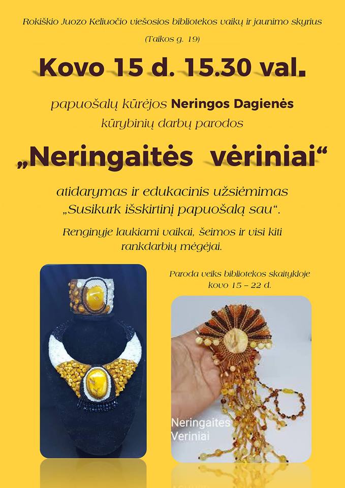 Rokiškio Juozo Keliuočio viešosios bibliotekos vaikų ir jaunimo skyriuje (Taikos g. 19), kovo 15 d. 15.30 val. papuošalų kūrėjos Neringos Dagienės kūrybinių darbų parodos „Neringaitės vėriniai“ atidarymas ir edukacinis užsiėmimas „Susikurk išskirtinį papuošalą sau“.