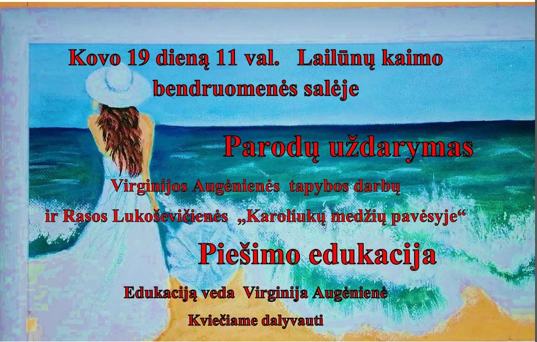Kovo 19 d. 11 val. Lailūnų kaimo bendruomenės salėje - parodų uždarymas: Virginijos Augėnienės tapybos darbų ir Rasos Lukoševičienės „Karoliukų medžių pavėsyje“.