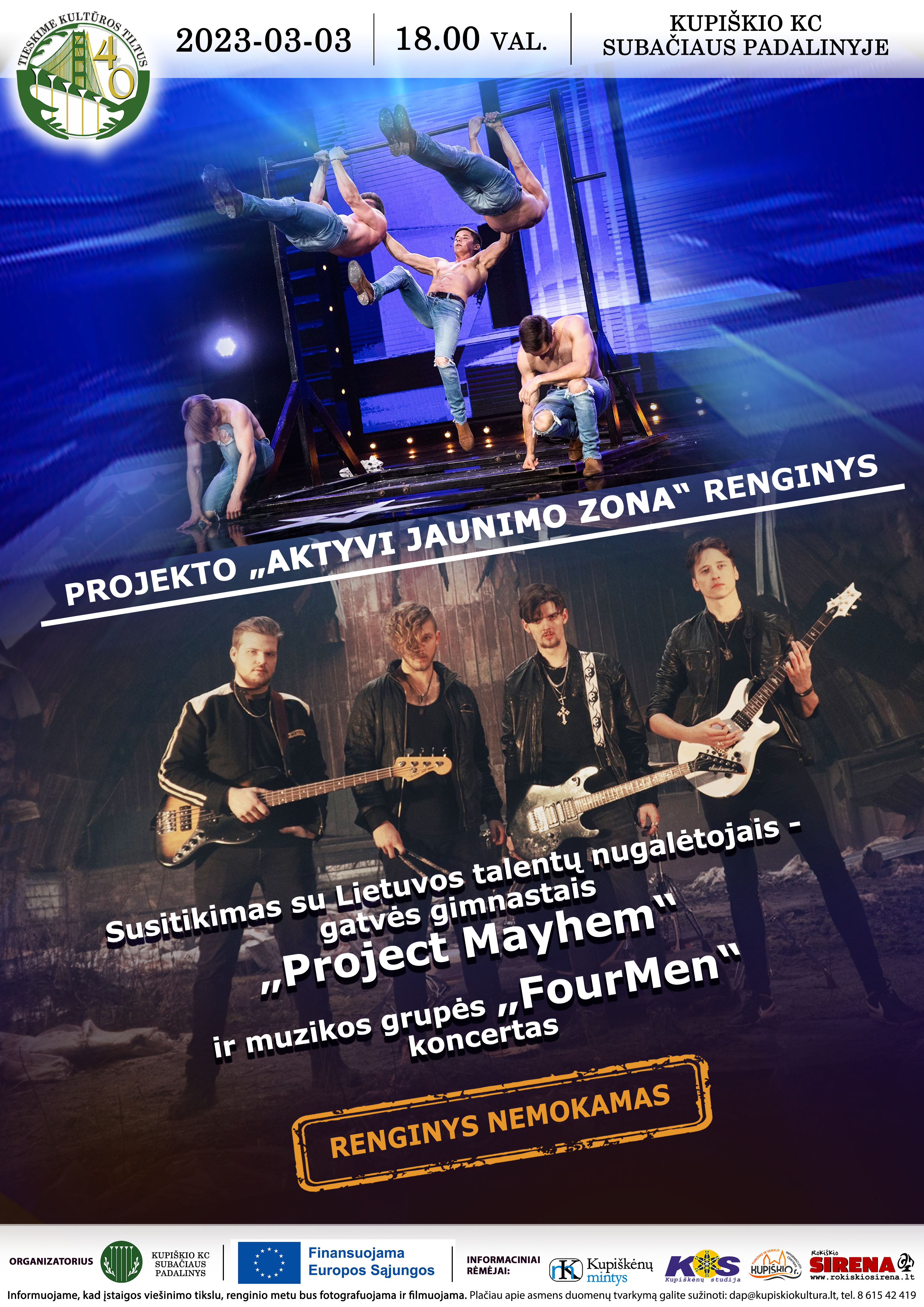 „Project Mayhem“ - tai viena stipriausių pasaulio komandų, žinoma savo įspūdingais ir originaliais gatvės gimnastikos pasirodymais. Susitikimas su šiais 2015 m. Lietuvos talentų nugalėtojais yra viena iš jaunimui skirto projekto „Aktyvi jaunimo zona“ veiklų skatinanti domėjimasi fiziniu aktyvumu. Gimnastų šou apšildys muzikos grupė „FourMen“ (vad. M. Garalevičius) - keturi muzikalūs vaikinai iš Pasvalio kultūros centro Vaškų skyriaus.