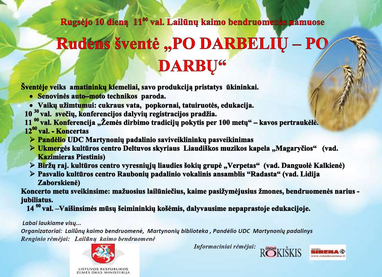 Jau 12-tą kartą visi susirenka į Lailūnų kaimo bendruomenės namus. Rugsėjo 10 dieną nuo 11 val. visi laukiami rudens šventėje „Po darbelių – po darbų“.