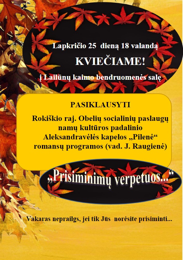 Lapkričio 25 d. 18 val. Lailūnų kaimo bendruomenė kviečia pasiklausyti Rokiškio raj. Obelių socialinių paslaugų namų kultūros padalinio Aleksandravėlės kapelos „Pilenė“ romansų programos (vad. J. Ragienė).