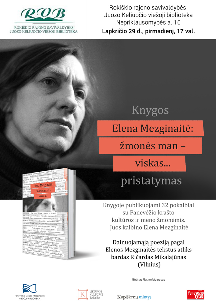 Lapkričio 29 d. 17 val. Rokiškio Juozo Keliuočio viešosios bibliotekos renginių salėje - knygos „Elena Mezginaitė: „Žmonės man – viskas...“ pristatymas.