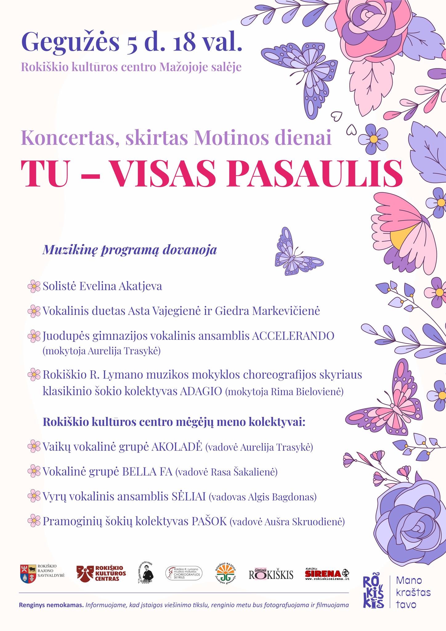 Gegužės 5 d. 18 val. Rokiškio kultūros centro Mažojoje salėje koncertas skirtas Motinos dienai „Tu – visas pasaulis“.