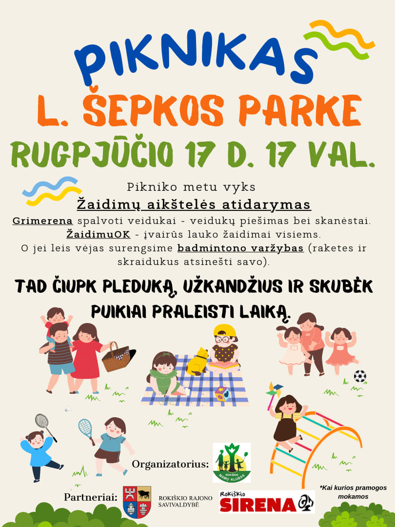 Rugpjūčio 17 d. 17 val. Piknikas L. Šepkos parke. Pikniko metu vyks žaidimų aikštelės atidarymas.