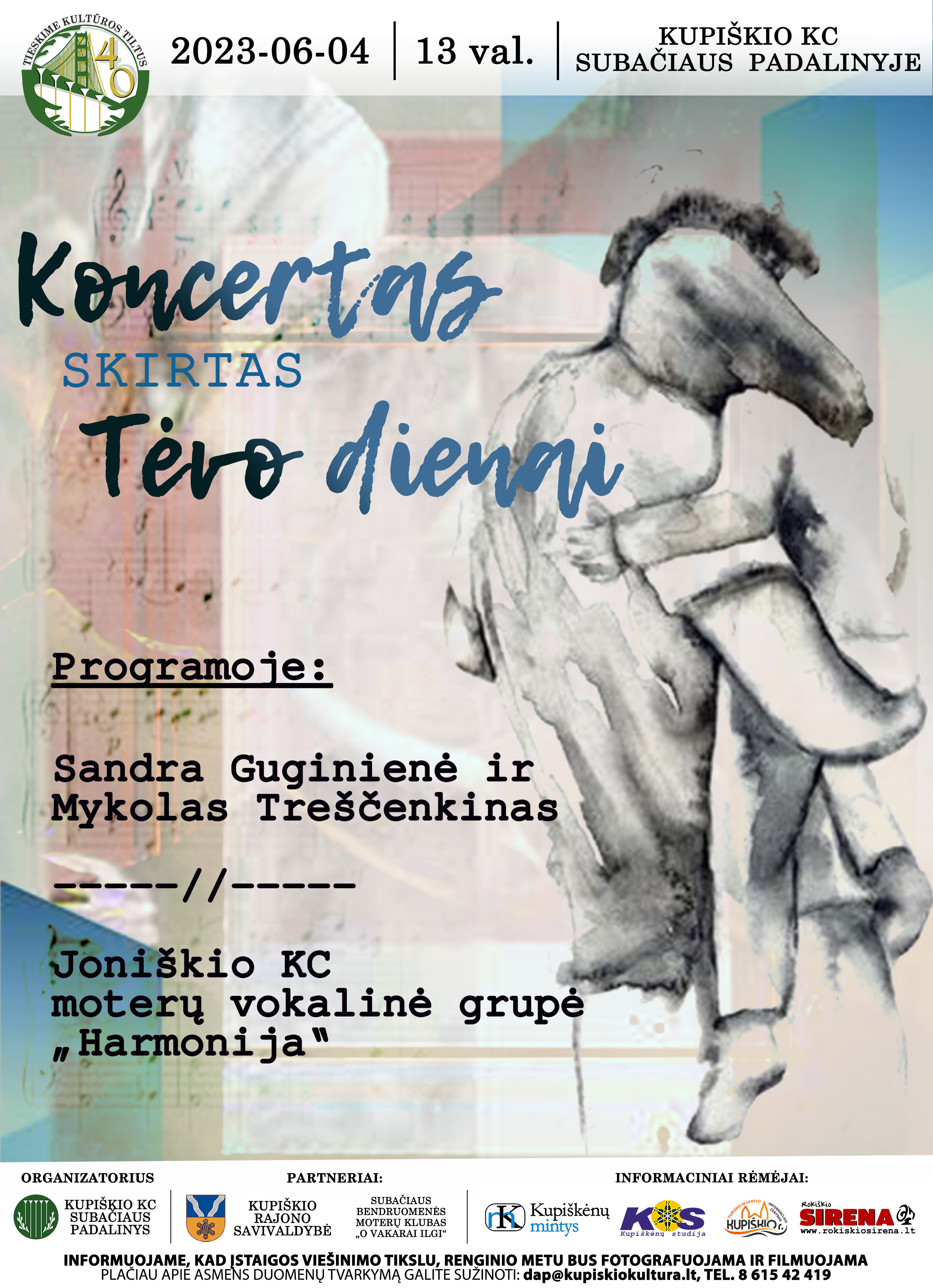 2023-06-04 13 val. Kupiškio KC Subačiaus padalinyje koncertas Tėvo dienai. Programoje: Sandra Guginienė ir Mykolas Treščenkinas, Joniškio KC moterų vokalinė grupė „Harmonija“. Adresas: Aukštaičių a. 14, Subačius, Kupiškio r.