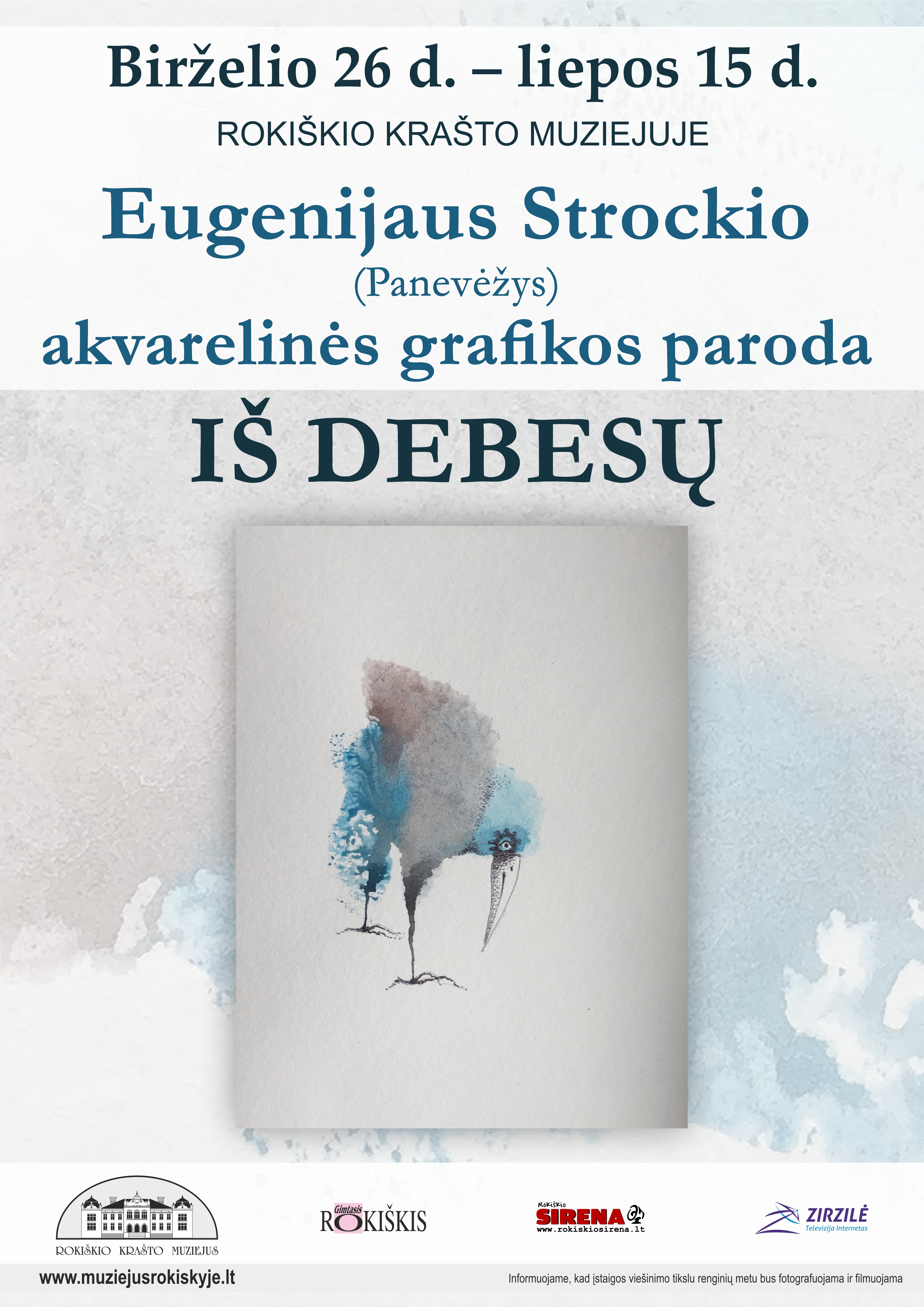 Birželio 26 d. – liepos 15 d. Rokiškio krašto muziejuje Eugenijaus Strockio (Panevėžys) Akvarelinės grafikos paroda „IŠ DEBESŲ“. Maloniai kviečiame atvykti.