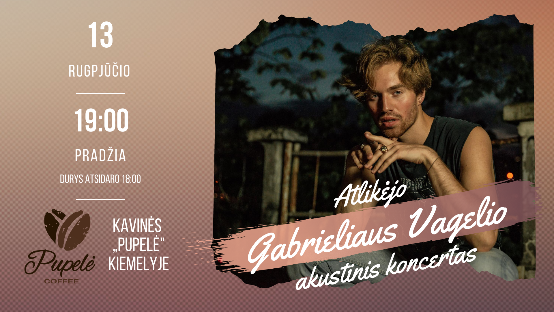 Rugpjūčio 13 d., kavinės „Pupelė“ kiemelyje - atlikėjo Gabrieliaus Vagelio akustinis koncertas.