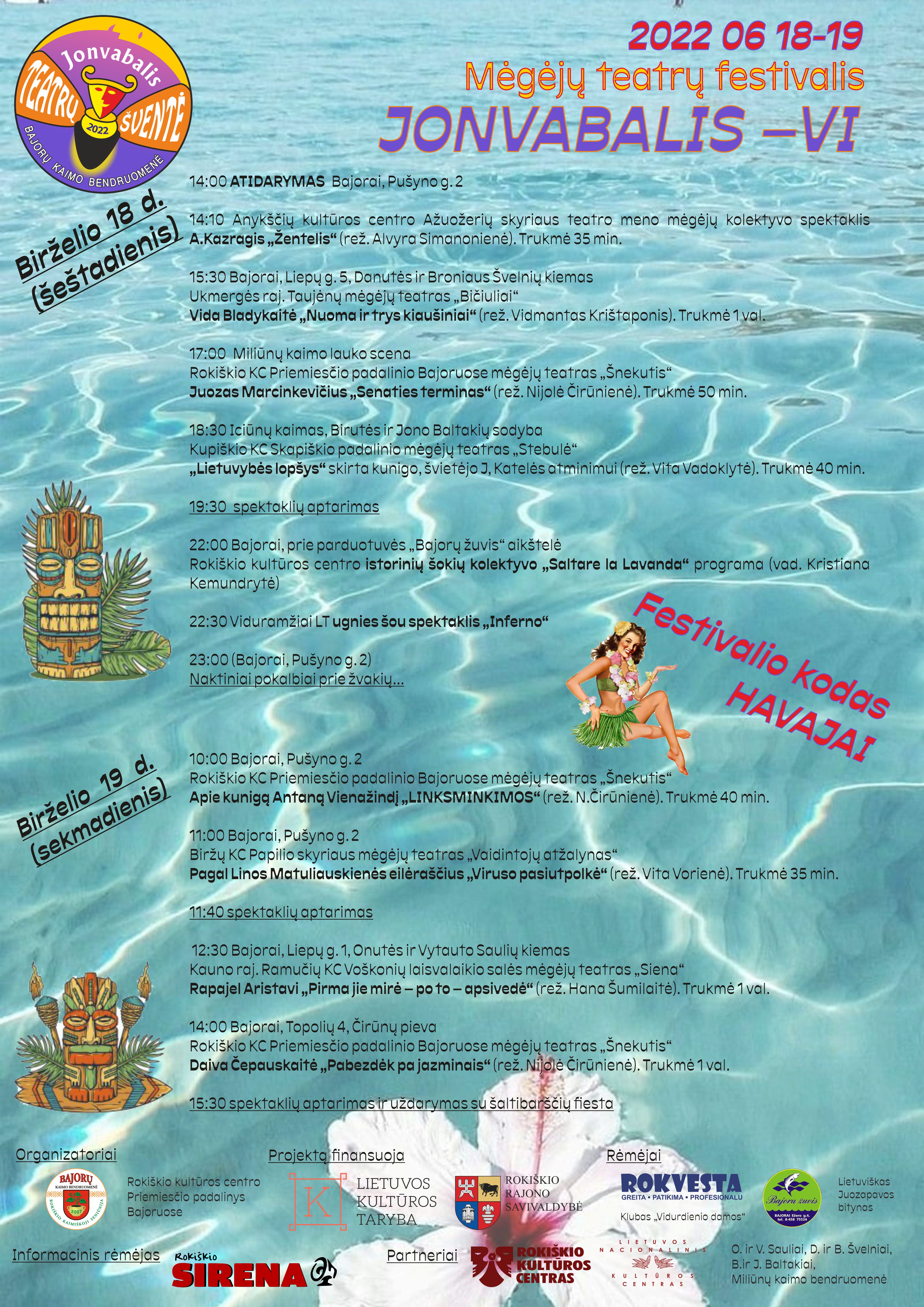 Festivalis teminis. Šių metų tema – Havajai, taigi visiems žiūrovams privaloma derinti savo aprangą bei aksesuarus prie temos. Kviečiame įvairaus amžiaus teatro gerbėjus betarpiškai pasimėgauti pastarųjų metų mėgėjų teatrų kūrybos vaisiais, o festivalio dalyviams linkime patirti buvimo scenoje džiaugsmą ir magiją. Be to, dar laukia ir daugiau staigmenų bei netikėtumų!