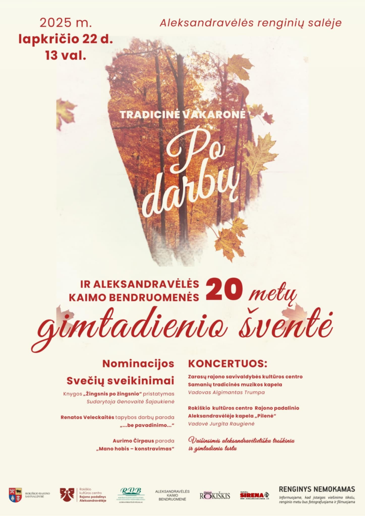 2025 m. lapkričio 22 d. 13 val. Aleksandravėlės kaimo bendruomenė kviečia visus į jaukią ir šiltą tradicinę vakaronę „Po darbų“, šiemet ypatingą – minėsime bendruomenės 20-ąjį gimtadienį!