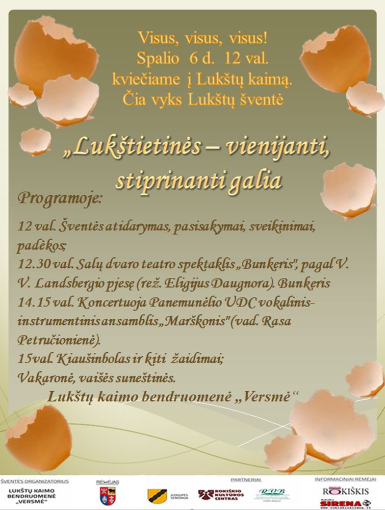 Spalio 6 d. nuo 12 val. Lukštų kaimo bendruomenė „Versmė" rengia tradicinę šventę „Lukštietinės - vienijanti, stiprinanti galia".