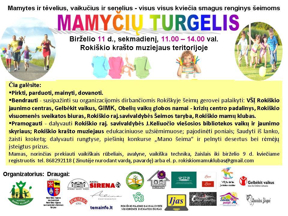 Birželio 11 dieną, 11 val. Rokiškio krašto muziejaus teritorijoje įvyks jau trečiasis „Mamyčių turgelis“. Rokiškio mamų klubas, bei daug prisijungusių draugų kviečia: pirkti, parduoti, mainyti, dovanoti, ir, žinoma, bendrauti bei pramogauti.