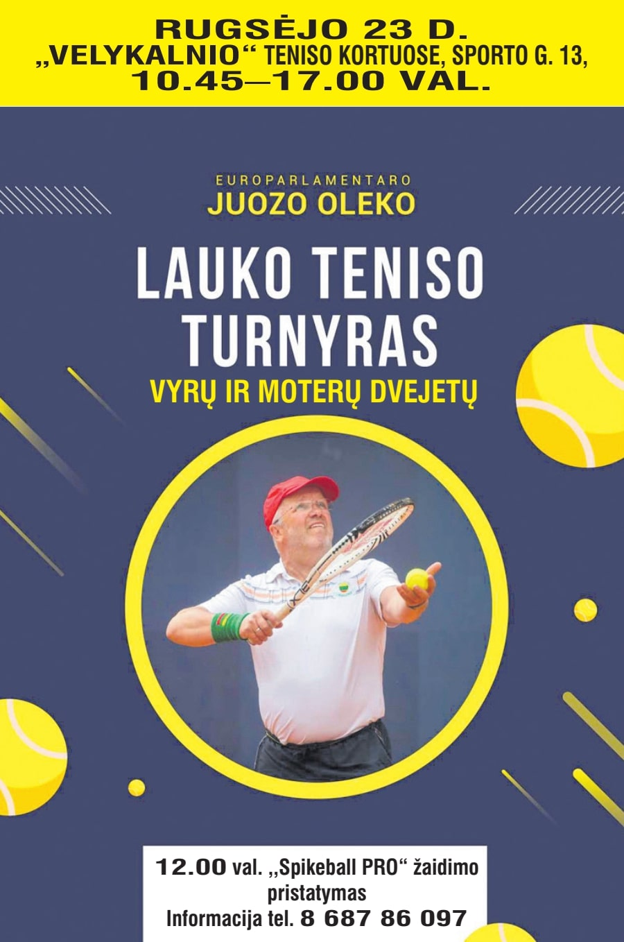 Rugsėjo 23 d. Rokiškyje, Velykalnio teniso kortuose (Sporto g. 13) 10:45 – 17:00 val. vyks europarlamentaro Juozo Oleko lauko teniso turnyras (vyrų ir moterų dvejetų).