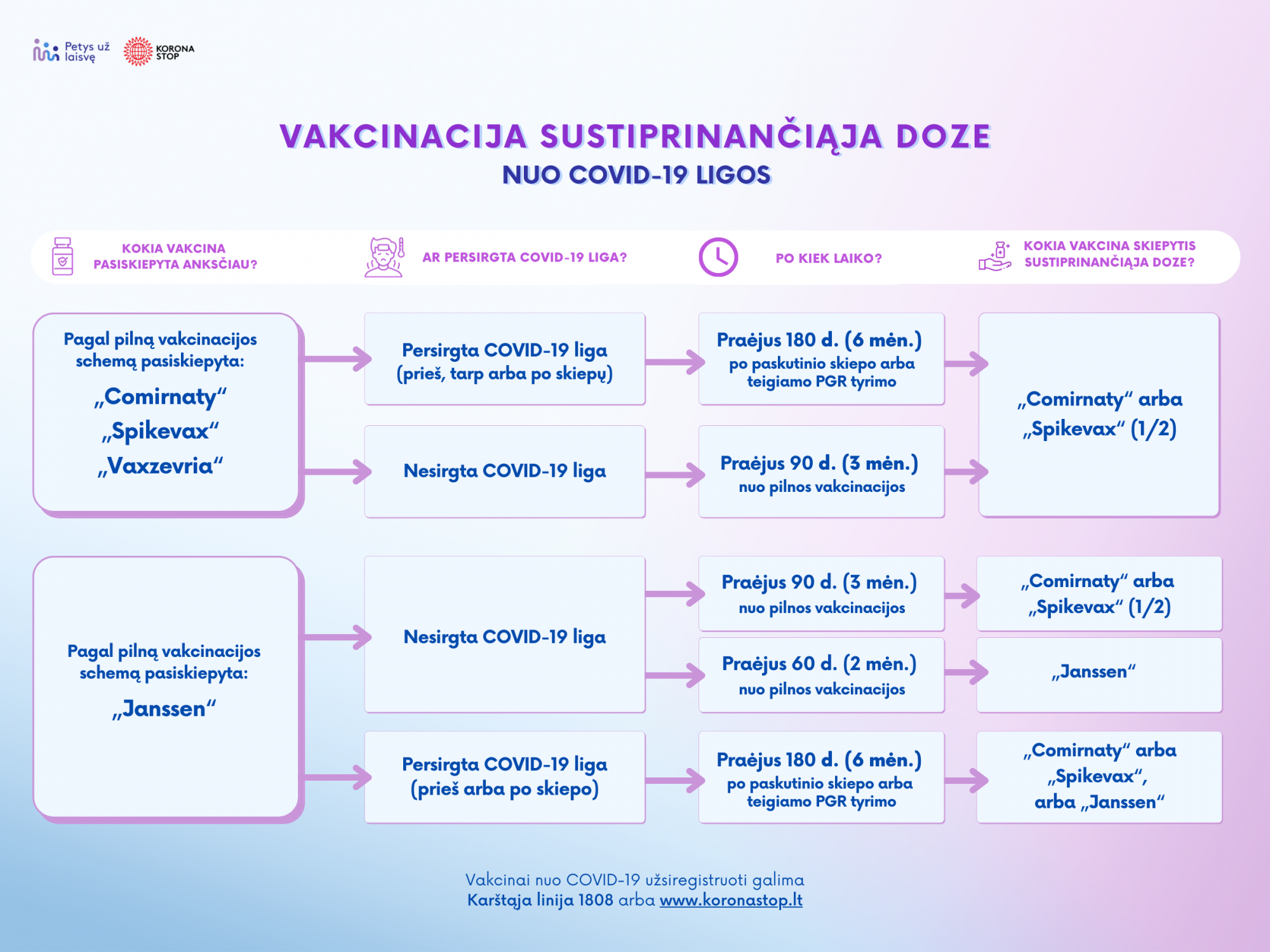 Pagal pilną schemą nuo COVID-19 ligos paskiepyti ir šia liga persirgę gyventojai nuo šiol taip pat galės pasiskiepyti sustiprinančiąja vakcinos doze. Atnaujinta skiepijimo tvarka taip pat numato galimybę „Janssen“ vakcina pasiskiepijusiems gyventojams anksčiau gauti sustiprinančiąją tos pačios vakcinos dozę – tai padaryti jau galima ne po 120, o po 60 dienų.