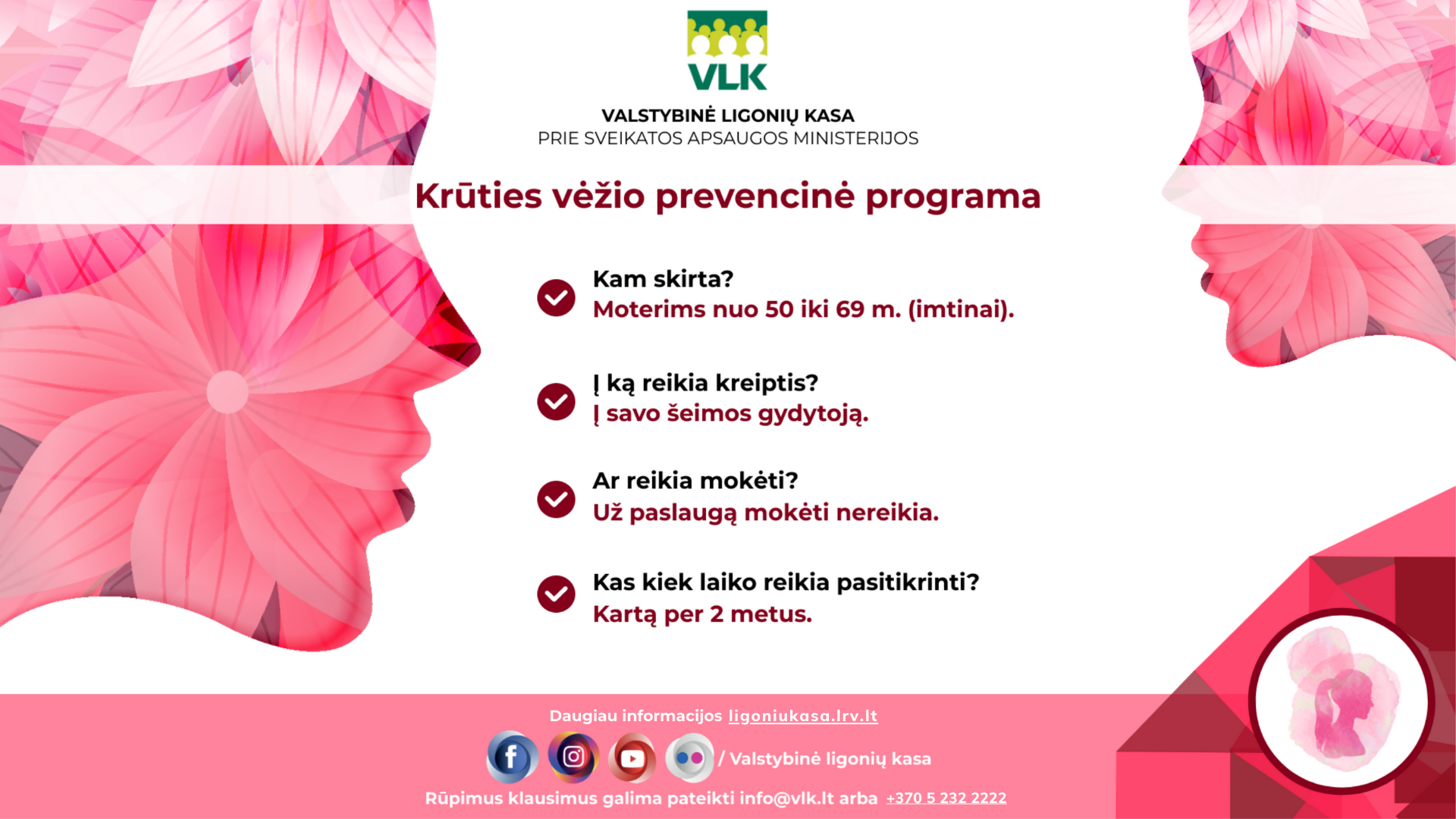 Ligonių kasos primena, kad labai svarbu ne tik valdyti krūties vėžio atsiradimo rizikos veiksnius, bet ir jį diagnozuoti kuo anksčiau – tada gydymo rezultatai būna geresni. Siekiant anksti užčiuopti ligą ir išsaugoti kuo daugiau moterų gyvybių, nuo 2005 metų Lietuvoje vykdoma krūties vėžio prevencinė programa. Ji skirta 50–69 metų moterims, kai rizika susirgti krūties vėžiu didžiausia. Patikra atliekama kas dvejus metus.