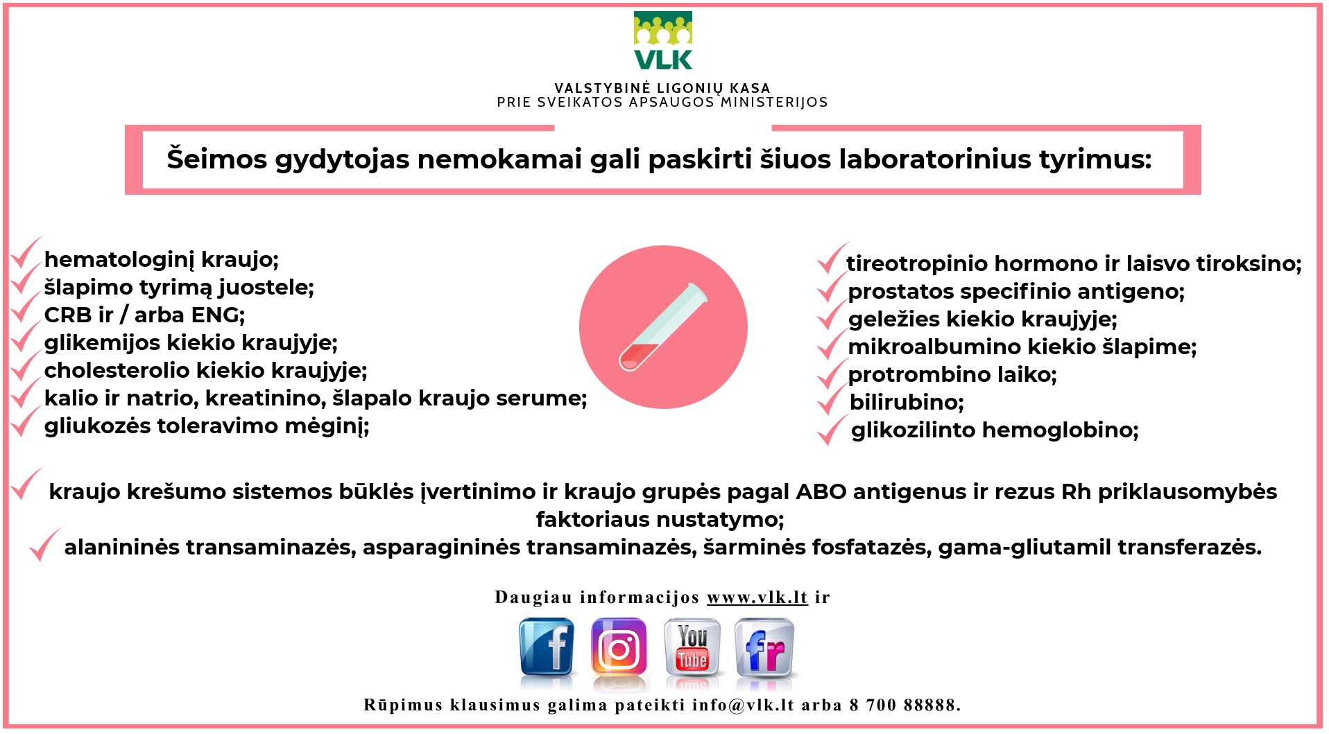 Panevėžio TLK informuoja, kad šeimos gydytojas, jei reikia, gali paskirti nemokamai atlikti šiuos laboratorinius tyrimus: