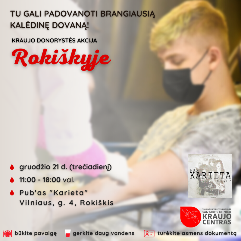 Kraujo donorystės akcija vyks pub'e Karieta (Vilniaus, g. 4, Rokiškis) nuo 11:00 iki 18:00 val. Ateikite ir pasidalinkite gerumu su kitais!