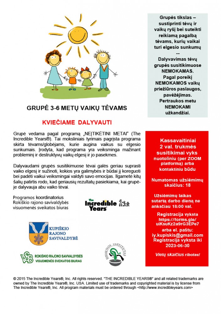 Kviečiame Kupiškio ir Rokiškio rajonų savivaldybių tėvelius dalyvauti programoje „Neįtikėtini metai” (The Incredible Years®)! Programa yra skirta tėvams/įtėviams/globėjams, auginantiems 3–6 metų amžiaus vaikus. Programa įgyvendinama daugiau nei 20 pasaulio šalių, moksliniais tyrimais įrodytas ilgalaikis jos efektyvumas. Programa padeda tėvams: