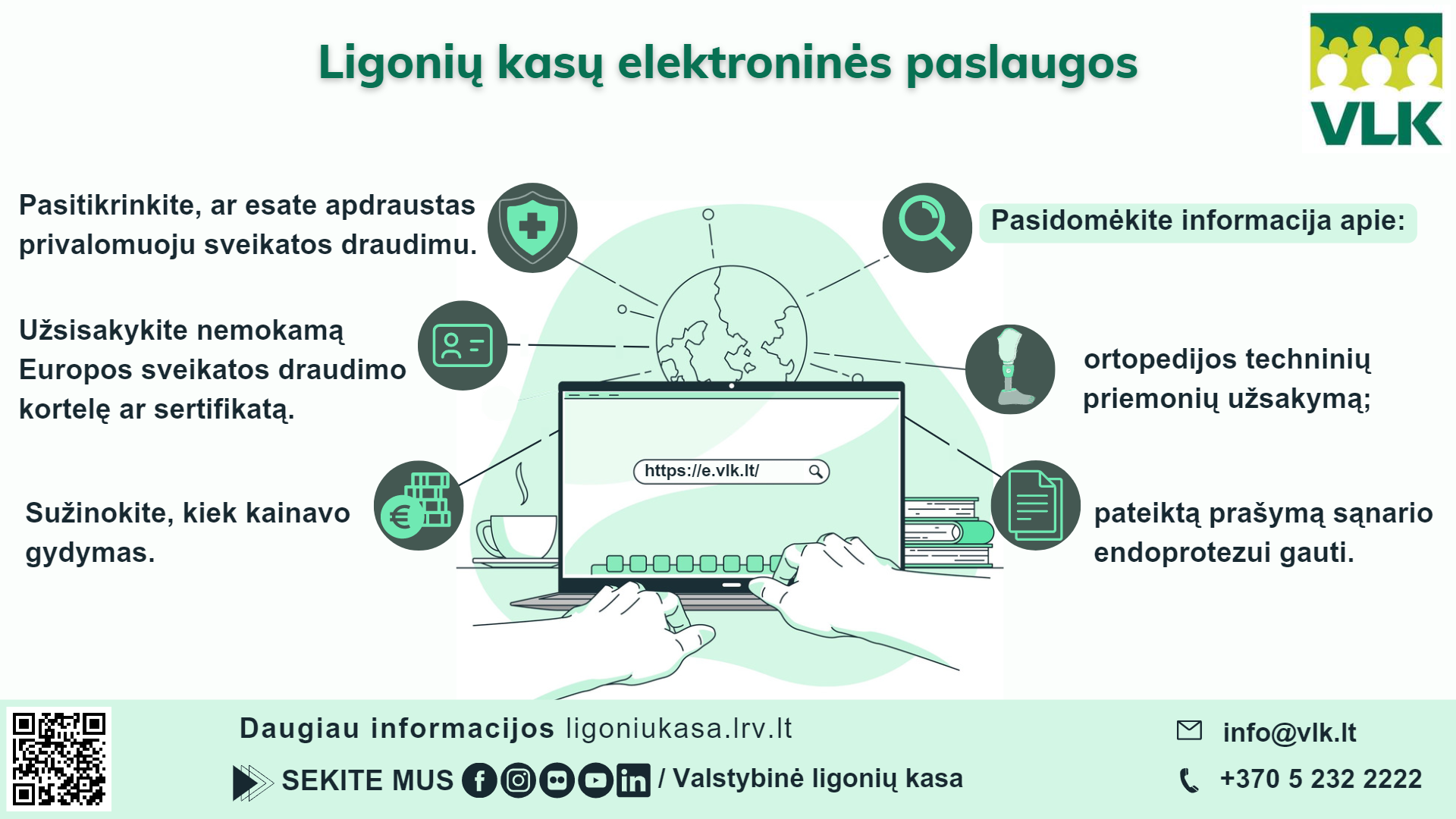 Kasmet apie 200 tūkstančių Lietuvos gyventojų, naudodami internetinę bankininkystę, elektroninį arba mobilųjį elektroninį parašą, ligonių kasų interneto svetainėje jungiasi prie Valstybinės ligonių kasos (VLK) elektroninių paslaugų portalo adresu e.vlk.lt. Prisijungę žmonės gali patogiai atlikti daug reikalingų su privalomuoju sveikatos draudimu (PSD) susijusių veiksmų ir rasti naudingos informacijos.