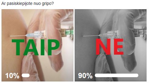 Balsavime dalyvavo 203 “Rokiškio Sirena“ skaitytojai. Didžioji dalis – net 90 proc. apklaustųjų (183 žmonės) teigė, kad nuo gripo jie nesiskiepijo ir tik 20 skaitytojų (10 proc.) teigė, kad nuo gripo jie skiepijosi.