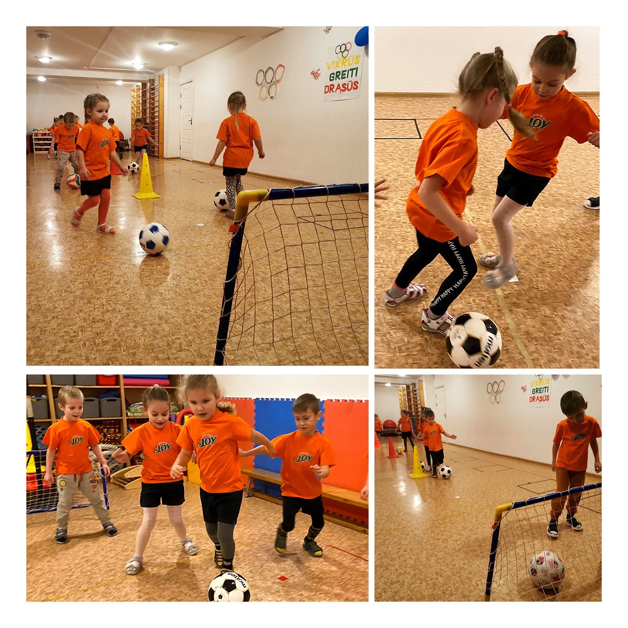 Rytinių mankštų metu, vaikai mokosi varytis kamuolį, pataikyti į vartus.