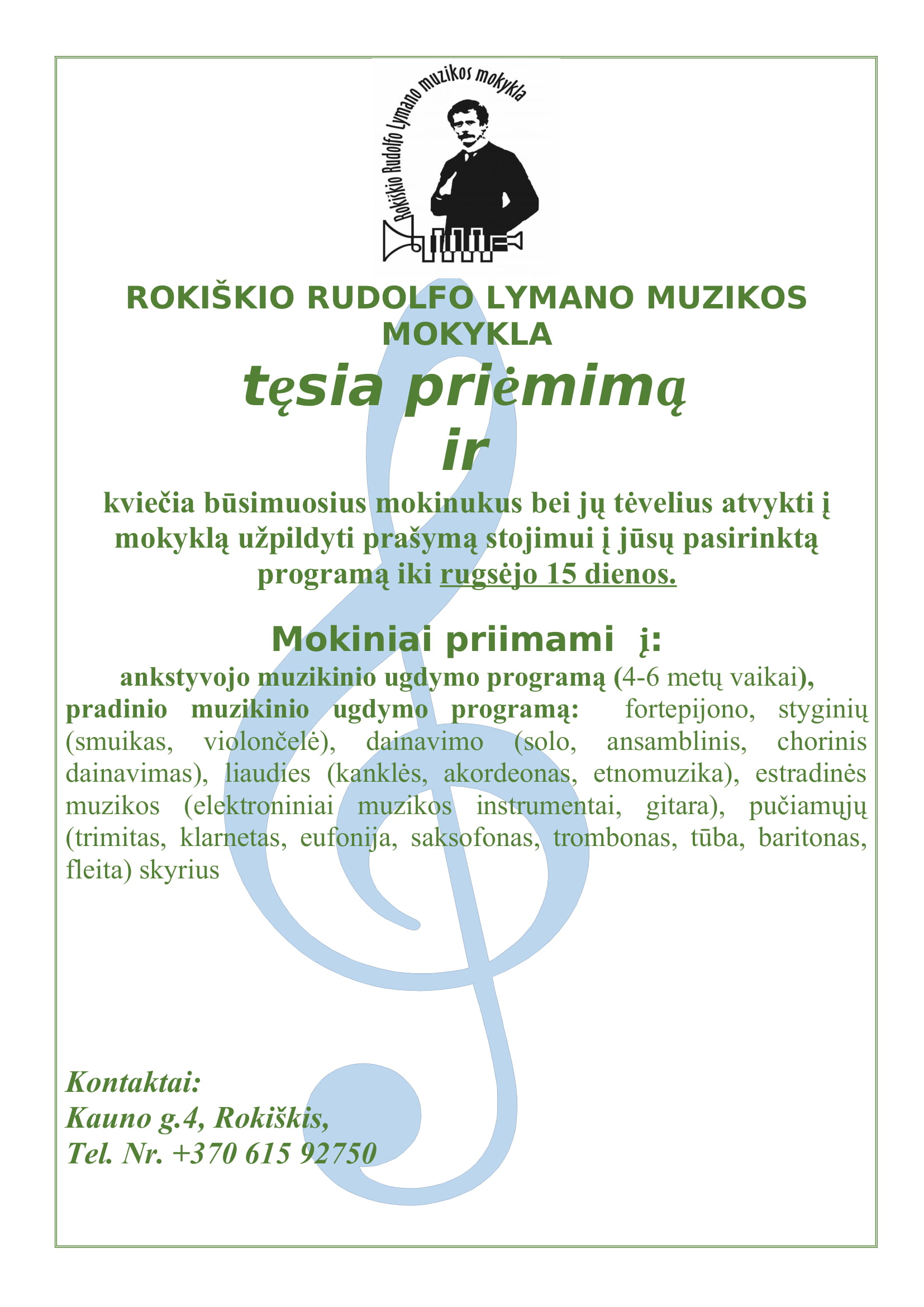 Iki rugsėjo 15 dienos pratęsiamas priėmimas į Rokiškio Rudolfo Lymano muzikos mokyklą.