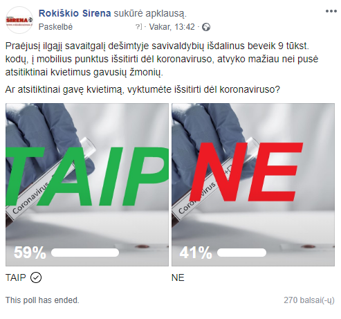 Ketvirtadienį „Rokiškio Sirenos“ Feisbuko profilyje paskelbėme apklausą. Skaitytojų klausėme: Ar atsitiktinai gavę kvietimą, vyktumėte išsitirti dėl koronaviruso?