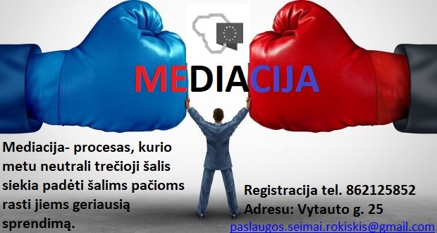 Dėl NEMOKAMŲ mediacijos paslaugų kreiptis telefonu 862125852, FB žinute arba adresu Vytauto g. 25, Bendruomeniniai šeimos namai.