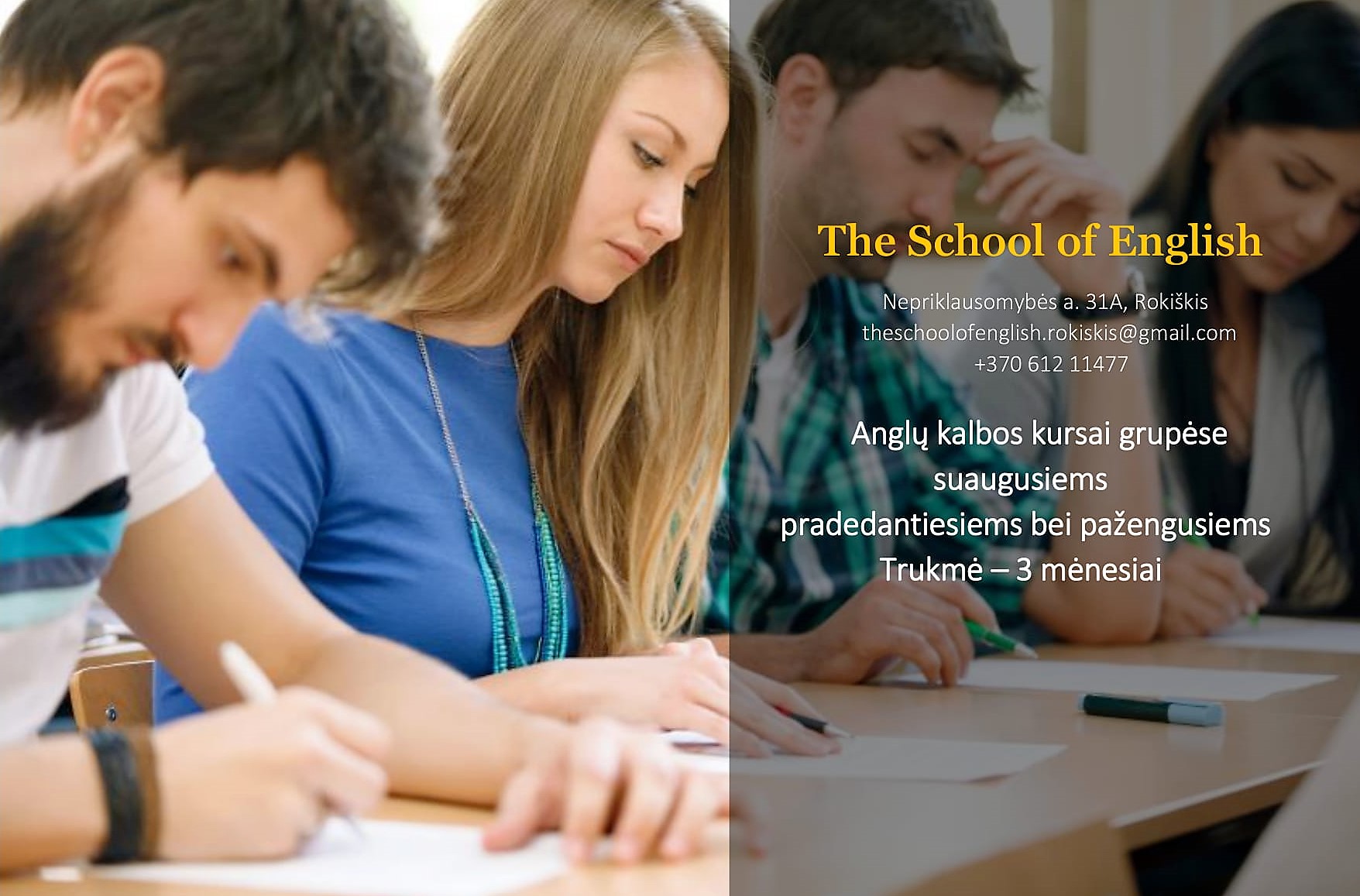 Organizuojamų anglų kalbos kursų suaugusiems grupėse dar yra vietų. Renkamos pradedančiųjų bei pradines žinias turinčių vakarinės grupės. Užsiėmimus pradėsime rugsėjo mėnesio 16, 17 dienomis. Paskubėkite registruotis telefonu 8 612 11477 arba e.paštu theschoolofenglish.rokiskis@gmail.com. Adresas - Nepriklausomybės a. 31A, Rokiškis