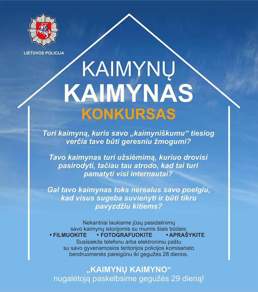 Kviečiame teikti pasiūlymus, nominuoti kaimynus. Informaciją iki gegužės 28 d. siųsti bendruomenės pareigūnei Jolitai Baltrūnienei: el. paštas: jolita.baltruniene@policija.lt, tel. nr. (8-687-98742)