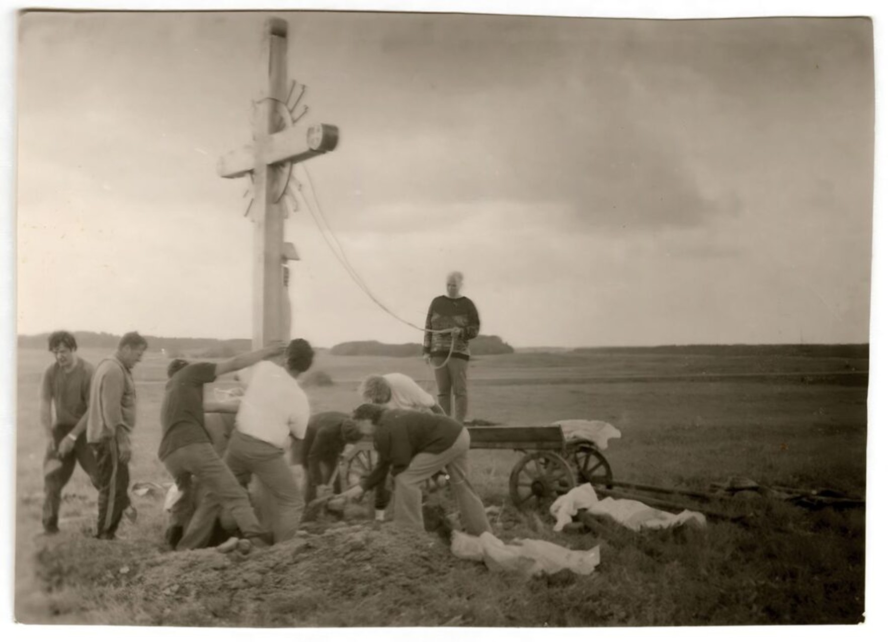 Rašytojas Alfonsas Danys stato kryžių sunaikintos tėviškės sodybos vietoje (Trumpiškės, 2000).