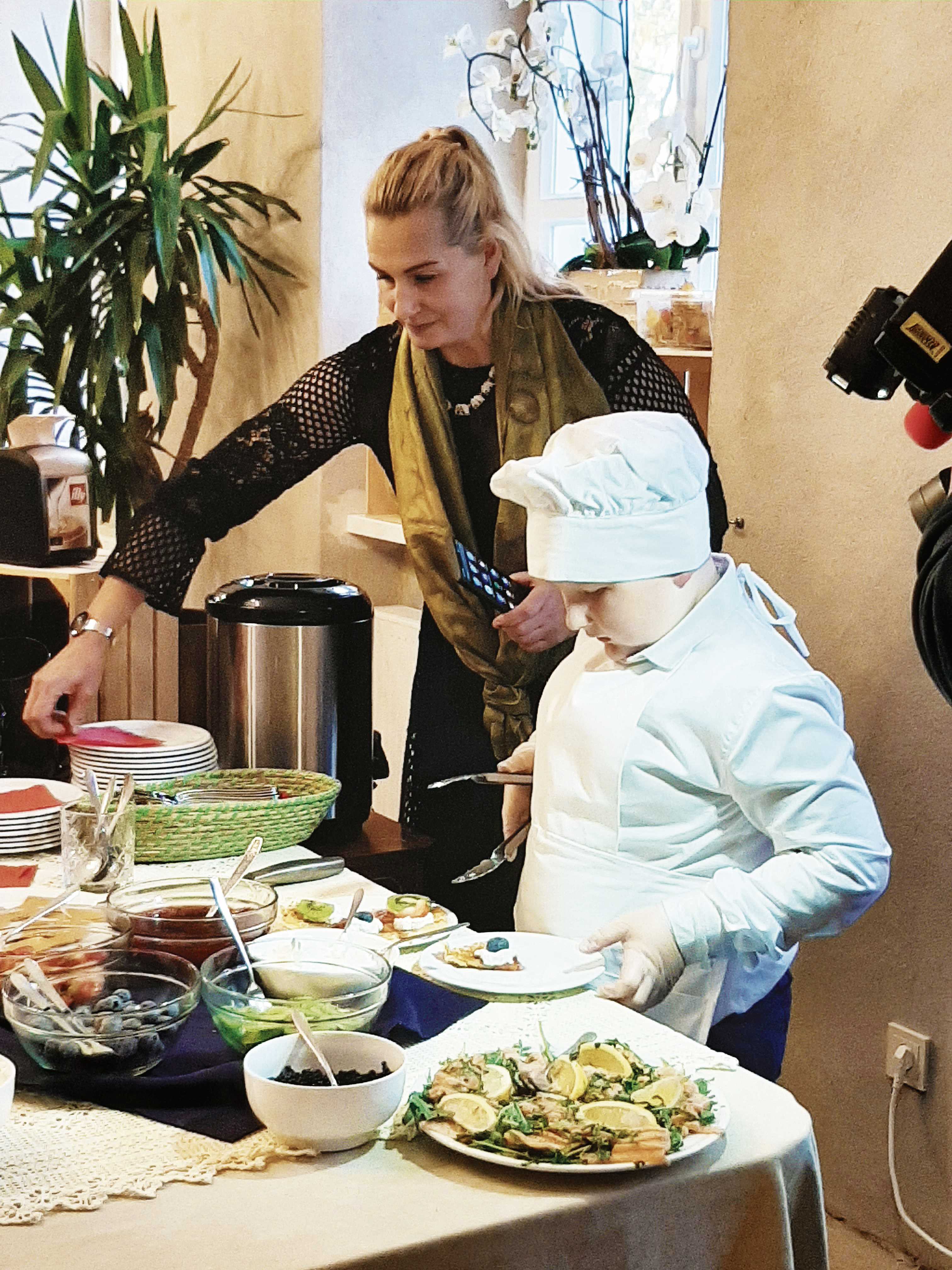 Praėjusį penktadienį Salų dvaro, Rokiškio rajone, restorano virtuvėje šeimininkavęs septynmetis Benas privertė ne vieną čia užsukusį svečią varvinti seilę – jaunasis šefas sukosi prie savo gaminamų desertų: kepė vaflius, gardino juos įvairais priedais, o trumpam atitrūkęs nuo darbo dalino interviu.